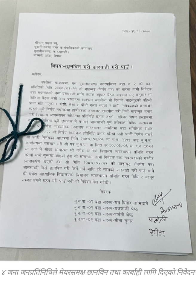 बूढानीलकण्ठ नगरपालिका समक्ष बिधालय ब्यवस्थापन समिति गठन त्रुटीपूर्ण रहेको भन्दै बूढानीलकण्ठ नगरपालिका वडा नम्बर २ का वडा सदस्यहरु बिनोद लामिछाने , राजकाजी श्रेष्ठ ,पार्वती श्रेष्ठ र सीता सुनार सहितको वडा समितिको निर्णय त्रुटीपूर्ण रहेको बताएको हो। वडा समितिको बैठक बस्दा बिधालय ब्यवस्थापन समिति गठन गर्ने भनि निर्णय नभएको वडा सदस्यहरुले दावी गरेको छ भने उक्त बैठकमा निर्णय नम्बर ६ मा बिधालय ब्यवस्थापन समितीको अध्यक्षमा राजेन्द्र श्रेष्ठ र सदस्यहरुमा मोहन प्रसाद लामिछाने , निशा बराललाई चयन गर्ने भनिएको निर्णय नभएको दावी गरेको हो ।