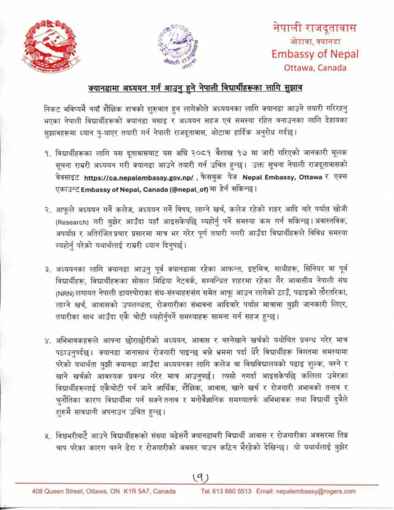 दूतावासले क्यानडा बसाइ र अध्ययन सहज एवं समस्यारहित बनाउनका लागि विभिन्न सुझाव जारी गर्दै ध्यान पुर्‍याएर तयारी गर्नसमेत अनुरोध गरेको छ ।