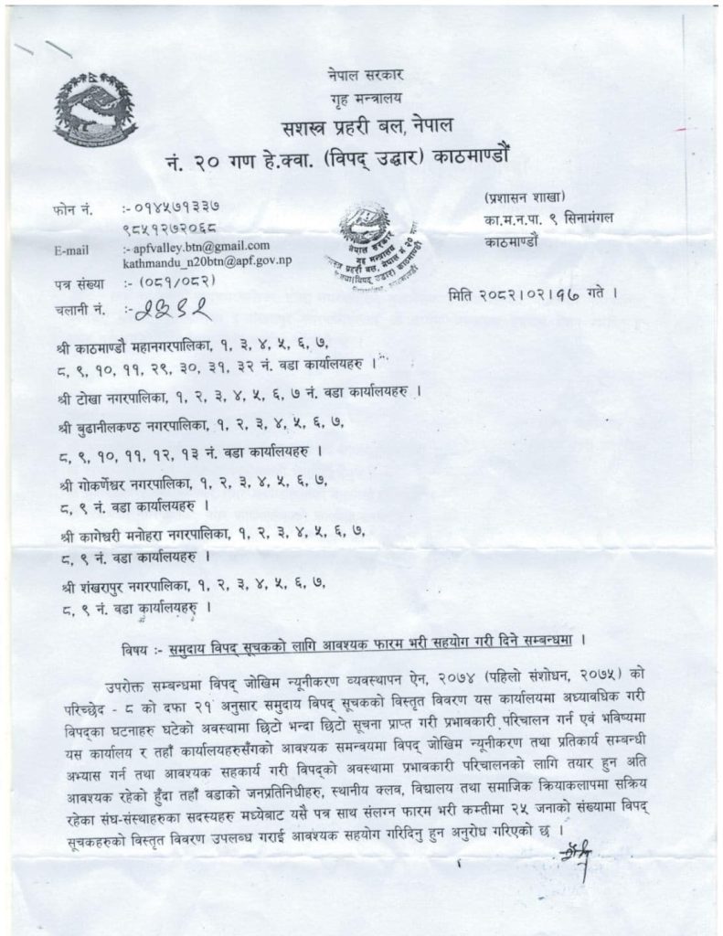 काठमाडौं, असार २५ — सशस्त्र प्रहरी बल, नेपालले बूढानीलकण्ठ नगरपालिका सहित काठमाडौं उपत्यकाका २५ वटा वडालाई समुदायस्तरमा विपद् जोखिम पहिचान गर्न ‘समुदाय विपद् सूचीकरण’ फारम भरी सहयोग गर्न अनुरोध गरेको छ।
