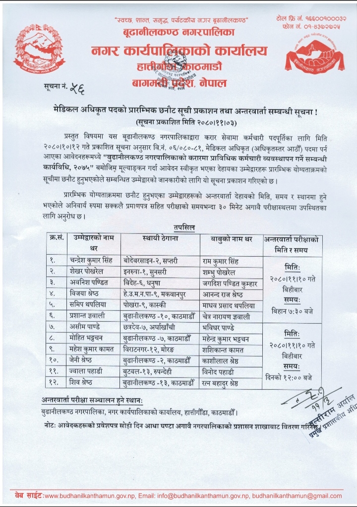 बूढानीलकण्ठ नगरपालिका करार सेवाको लागि बिज्ञापन नम्बर ०६-८०/८१ मेडिकल अधिकृत अधिकृतस्तर आठौंतहको पदमा बिज्ञापन माग अनुसार परेको निवेदन अनुसार बूढानीलकण्ठ नगरपालिकाको करारमा प्राविधिक कर्मचारी व्यवस्थापन गर्ने सम्बन्धी कार्यविधि २०७५ बमोजिम मूल्याङ्कन मूल्याङ्कन गरि आवेदन स्वीकृत भएका उम्मेदवारीहरूको प्रारम्भिक योग्यताक्रमको सूचीमा छनोट भएका जानकारीको लागि नगरपालिका उक्त सूचना जारी गरिएको हो।