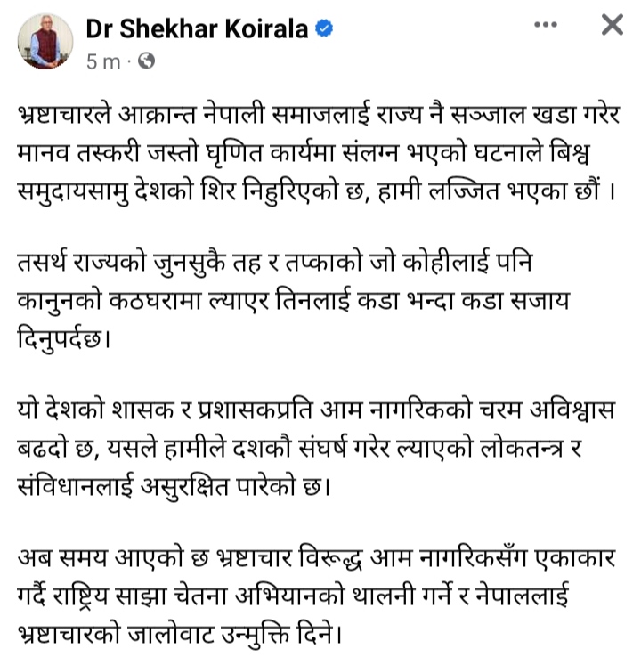 नेपाली काङ्ग्रेस नेता डा शेखर कोइरालाले सामाजिक संजाल मार्फत भ्रष्टाचारले बिश्व समुदायमा देशको शिर निहुरिएको र लज्जित हुनुपरेको भनी अभिव्यक्ति दिएका छ्न।