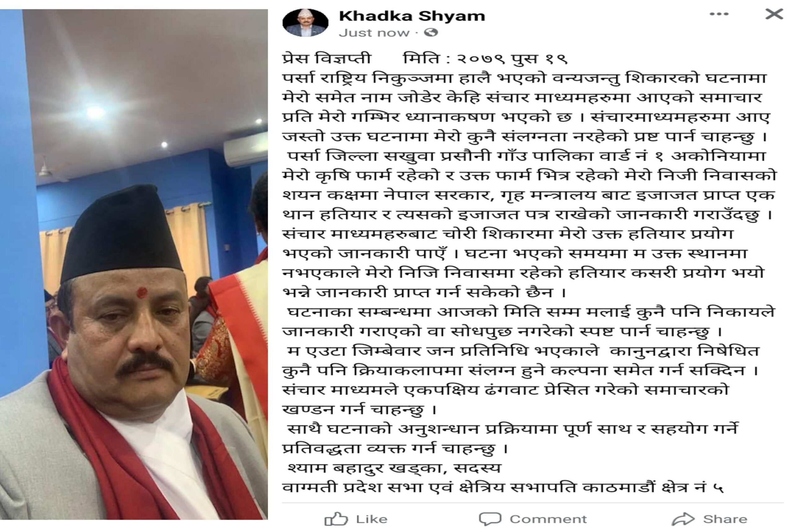 काठमाडौ क्षेत्र ५(ख) प्रदेशसभा सदस्य श्यामबहादुर खड्काद्वारा वन्यजन्तु शिकारको घटनाको विषयमा जारी गर्दै प्रेस विज्ञप्ती ।
