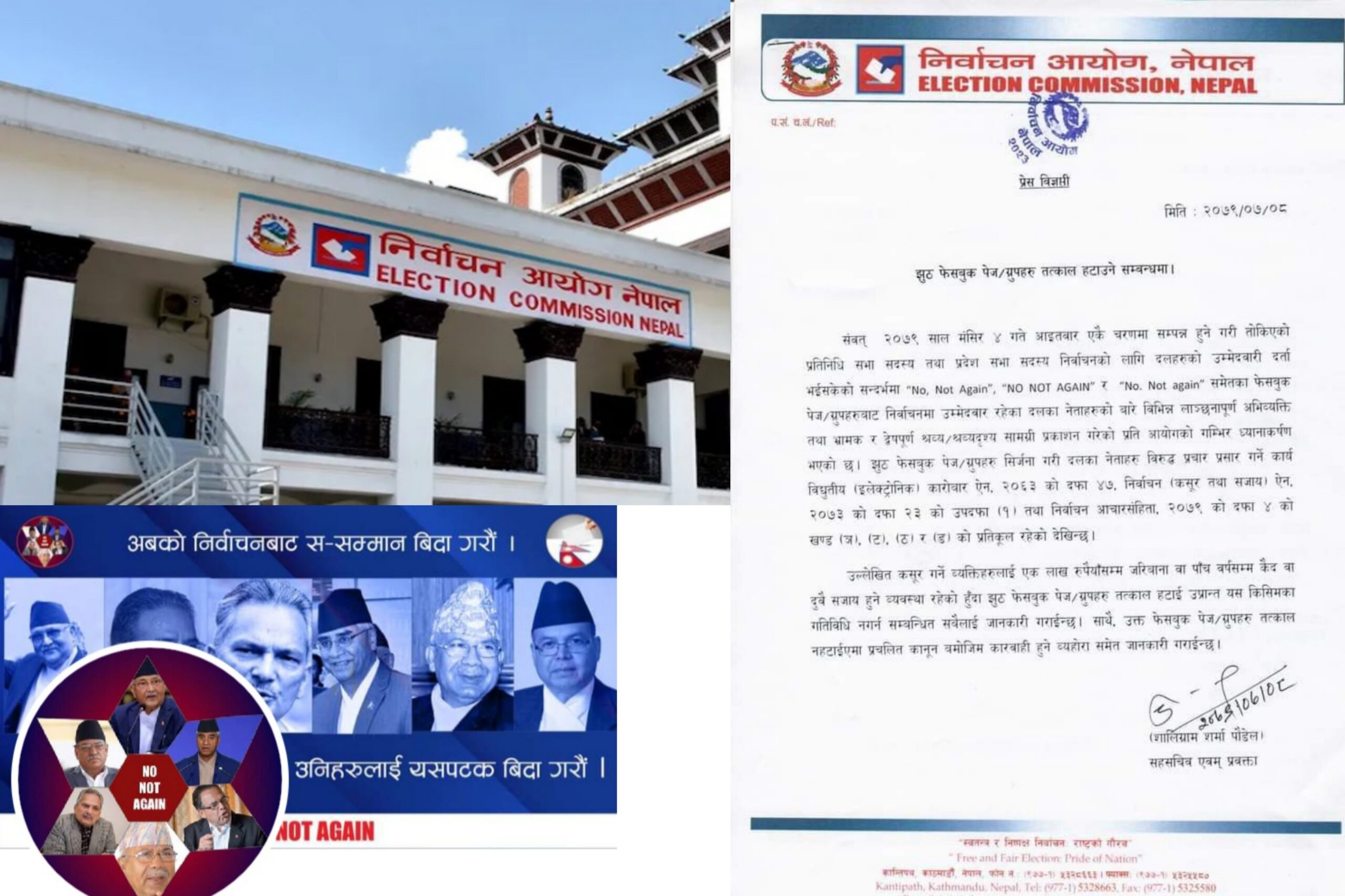 “नो नट एगेन” फेसबुक पेजबाट भ्रम सृजनागरिएको भनि निर्वाचन आयोग द्वारा जरिवाना गरिने भन्दै बिज्ञप्ति जारी ।