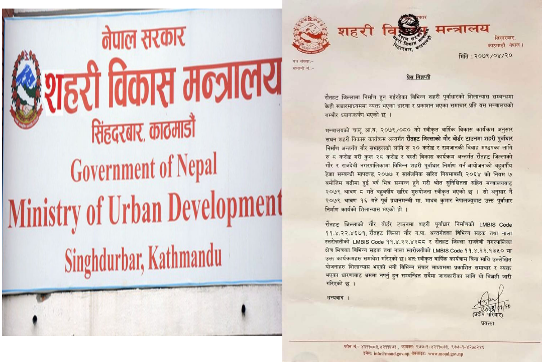 शहरी बिकास मन्त्रालयद्वारा गम्भीर ध्यानाकर्षण सम्बन्धि विज्ञप्ति जारी ।