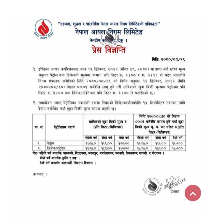 घट्यो पेट्रोलियम पदार्थको मुल्य, हेनुस मुल्यसुची ।