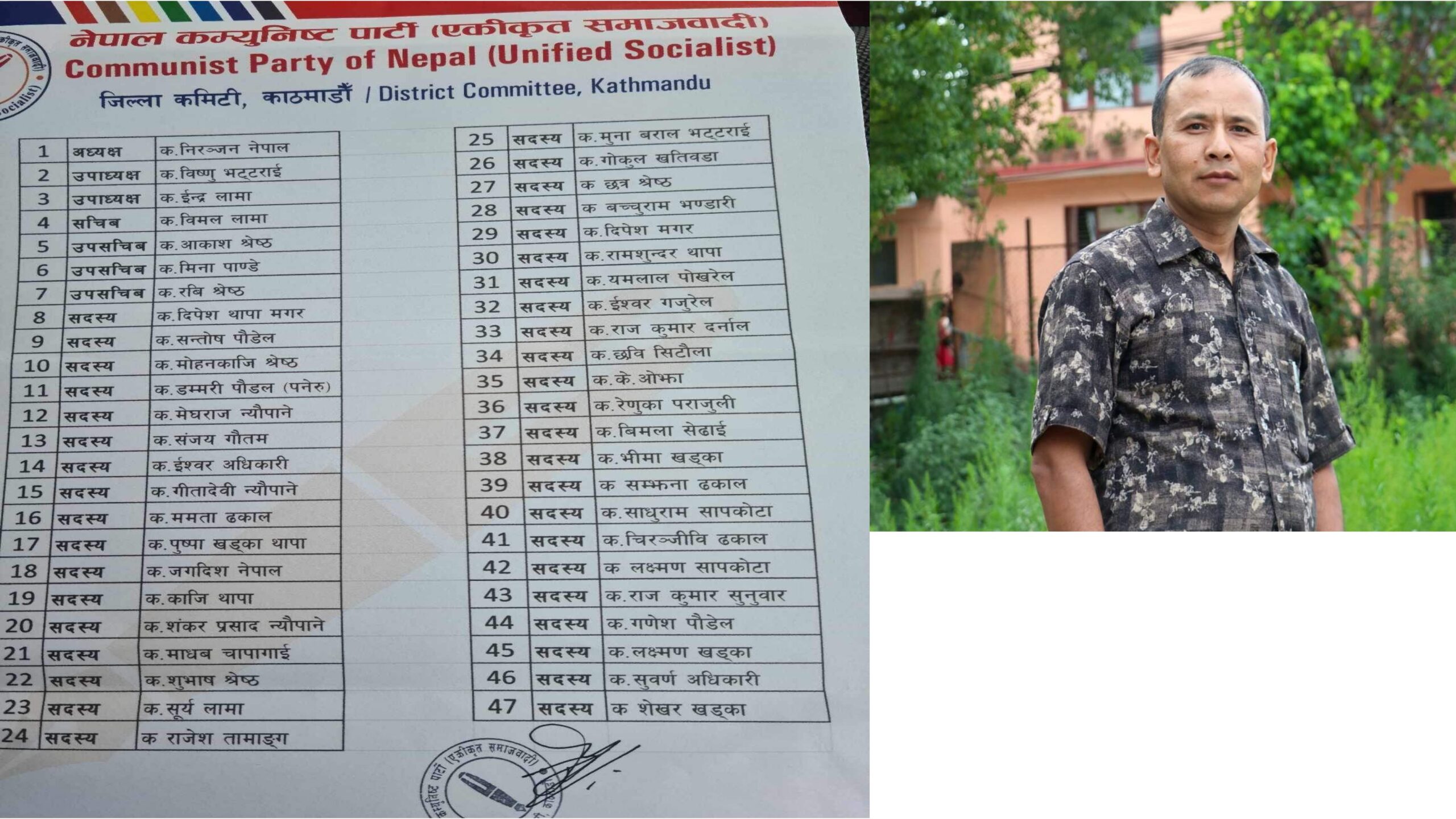 नेकपा एकीकृत समाजवादी बूढानीलकण्ठ नगरकमिटी अध्यक्षमा निरन्जन नेपालको अध्यक्षतामा ४७ सदस्य कमिटी गठन ।