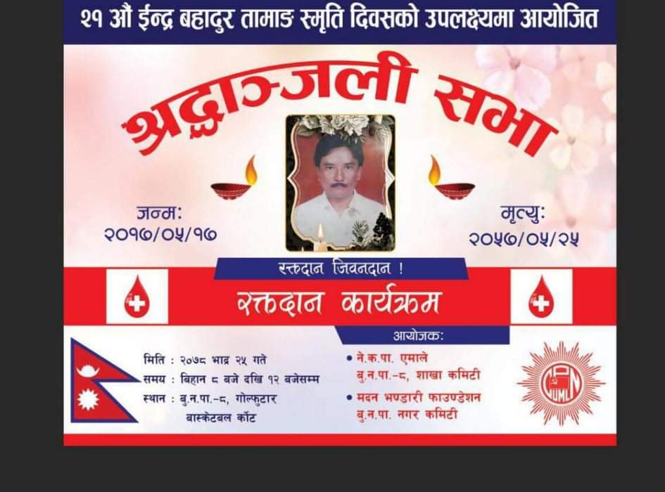 इन्द्रबहादुर तामाङको स्मृतीमा बुढानिलकण्ठ ८ मा बृहत रक्तदान कार्यक्रम हुँदै।