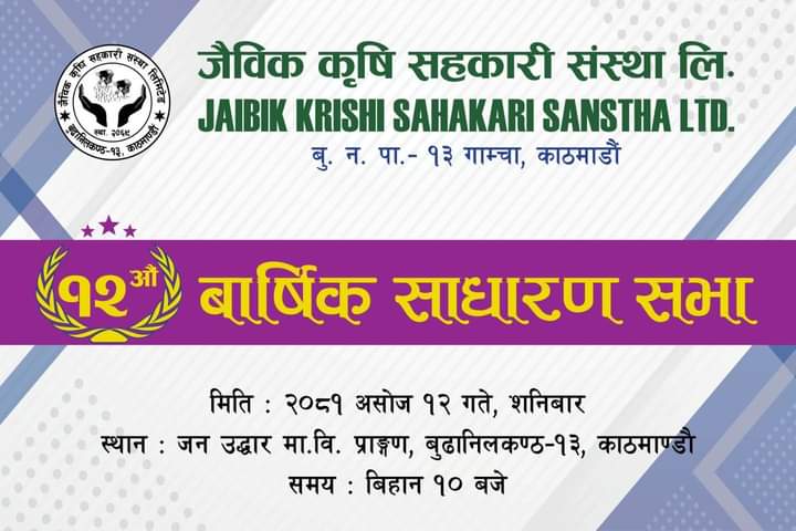 जैविक कृषि सहकारी संस्थाको १२ औं वार्षिक साधारणसभा असोज १२ गते हुने